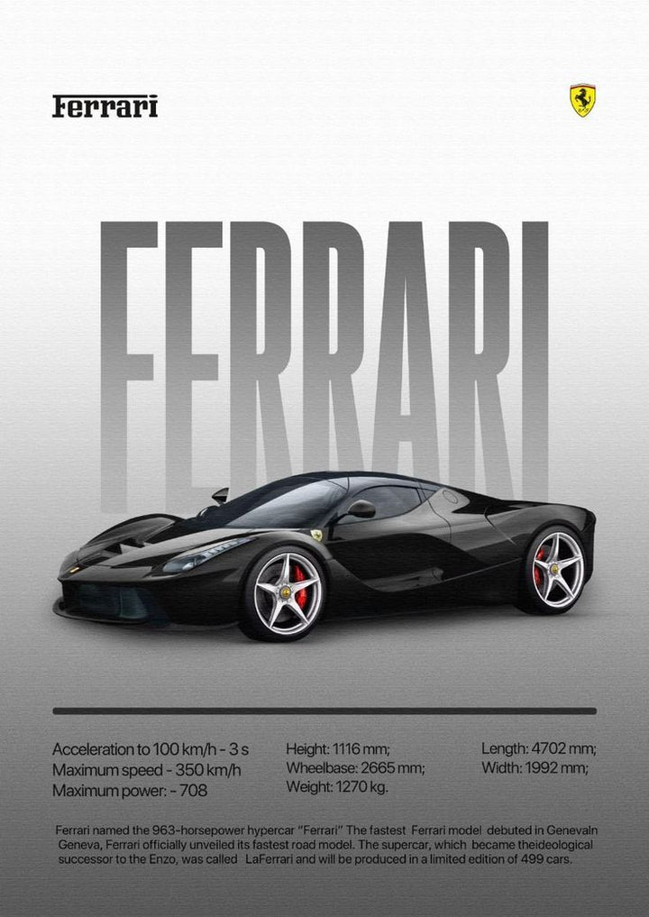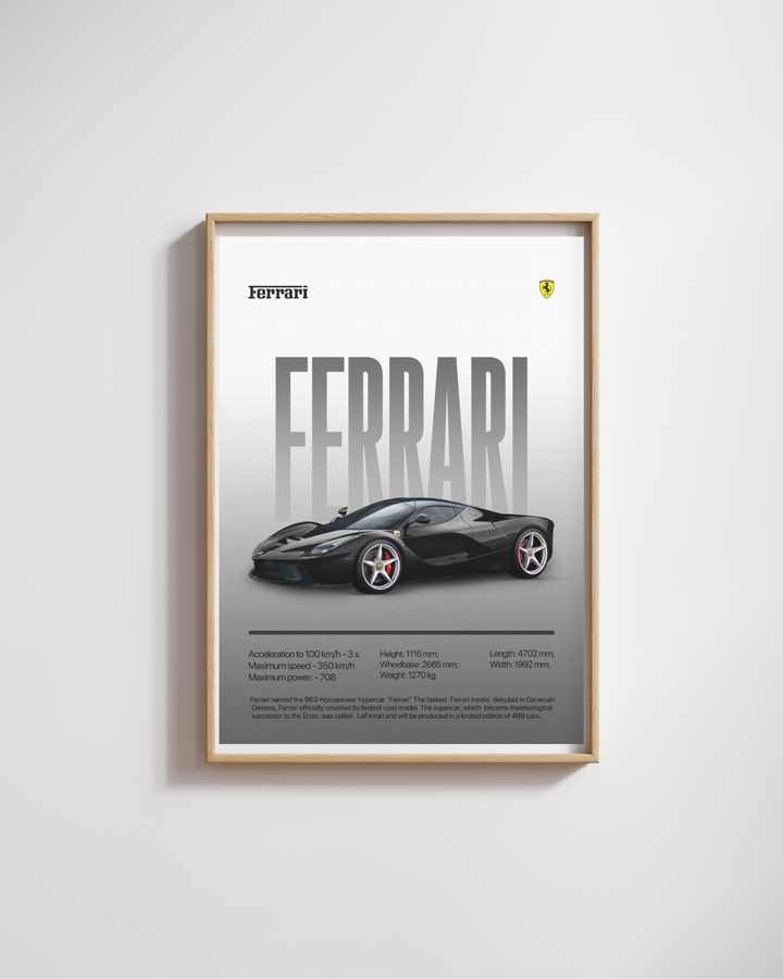 This poster showcases the Ferrari LaFerrari, one of the most iconic hypercars ever built — blending futuristic styling and raw performance. The clean typography and gradient background make it a striking premium art piece for: